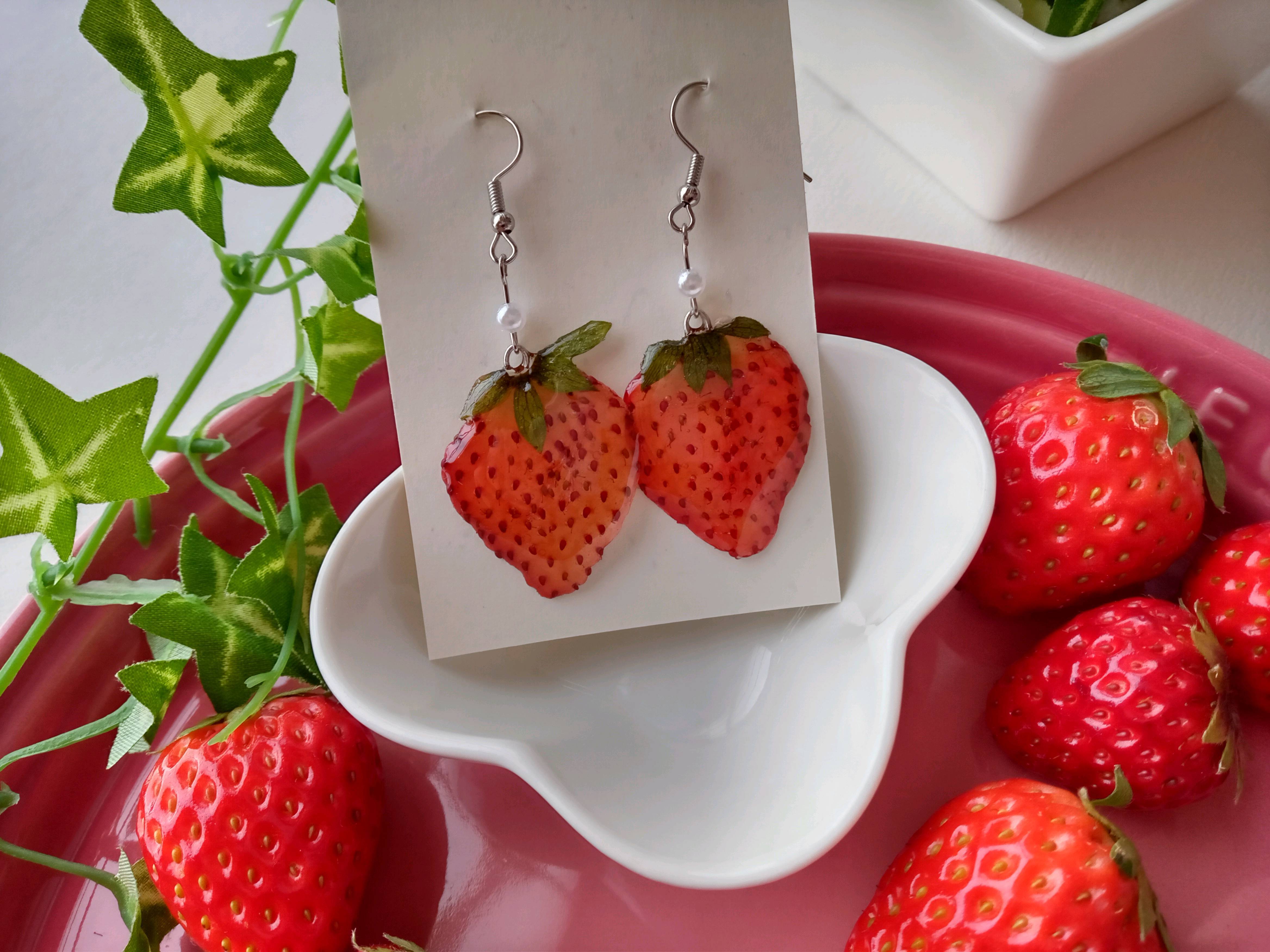本物の小さないちごを押しいちごにし、レジンでコーティングしました♩